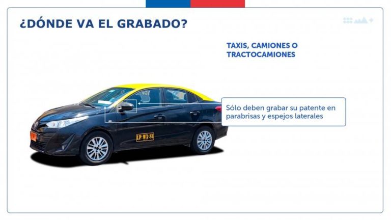 - El grabado de, al menos, 6 vidrios (laterales, luneta y parabrisas), además de los 2 espejos laterales. Ello, en caso que el vehículo tuviese más, donde sólo se exigirá el mínimo (ejemplo, furgones o buses). Ahora, si se trata de aquellos que cuenten con menos vidrios o espejos (por ejemplo, motos), la patente deberá estar grabada en todos sus espejos.